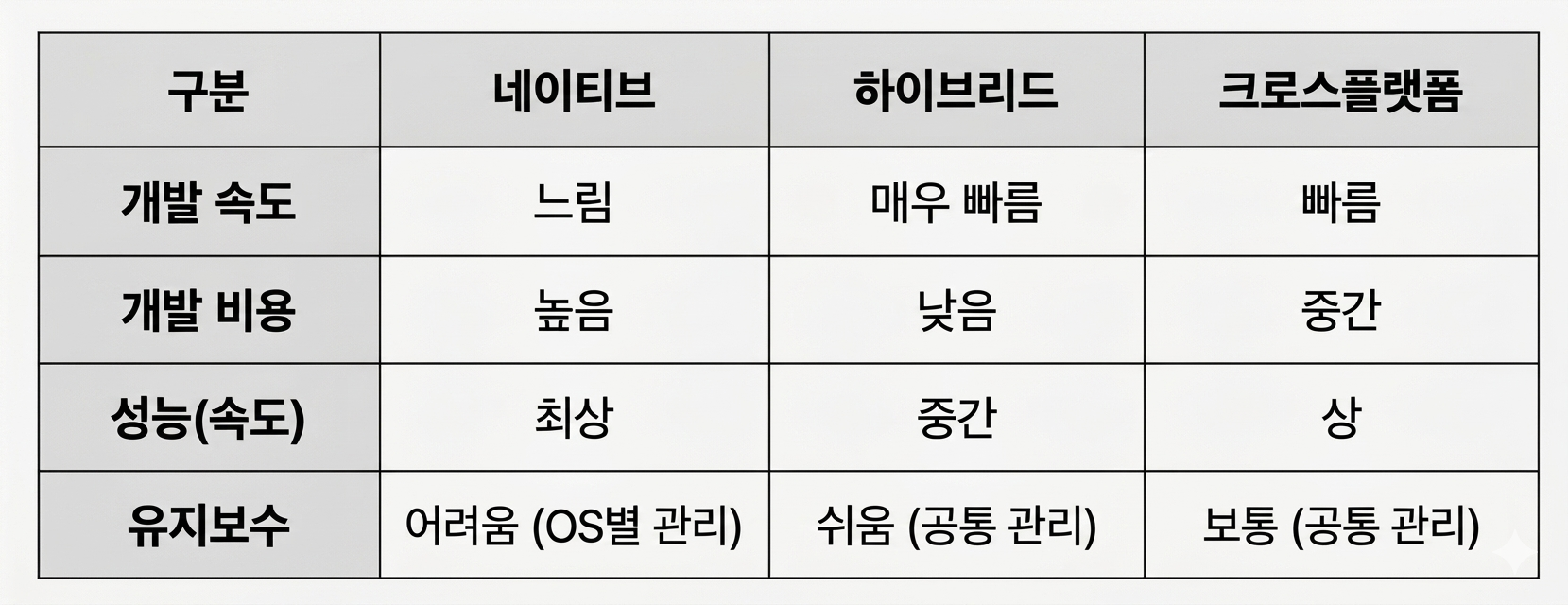 장점: 네이티브에 가까운 높은 성능을 내면서도 코드 하나로 두 마리 토끼를 잡을 수 있어 가성비가 매우 뛰어납니다. 개발 기간과 비용을 획기적으로 줄여줍니다.